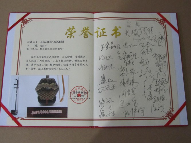 二胡制作大師丁家彭先生1949年出生樂器世家,17歲隨其祖父學琴藝,并深得精髓,其聰穎好學,悉心鉆研與 探求二胡制作,博得同行的欽佩贊許,更得了許多知名演奏家的稱贊,充分認識到二胡制作每個環(huán)節(jié),都對二胡制作都有影響力,因此對二胡的選材,選料,蟒皮都十分嚴格,二胡整體穩(wěn)定性良好,環(huán)境干擾影響極小。